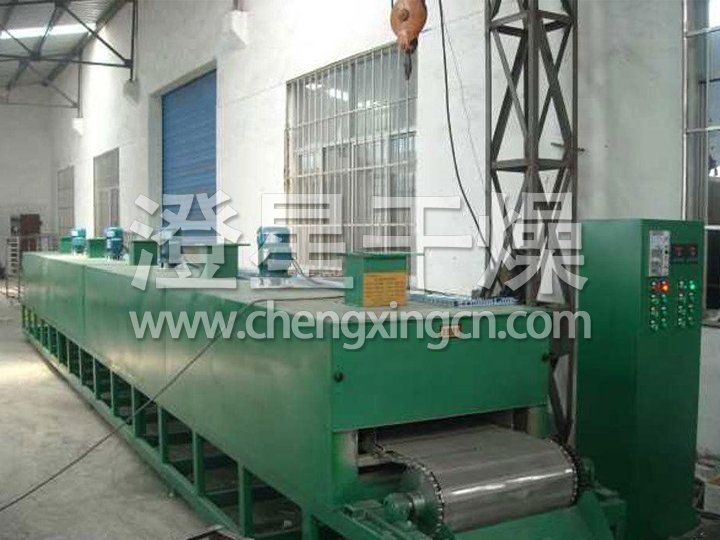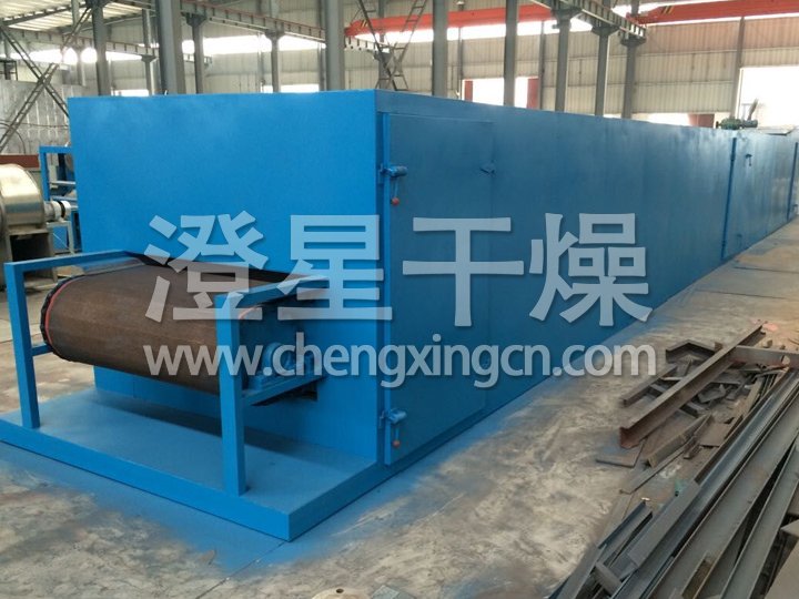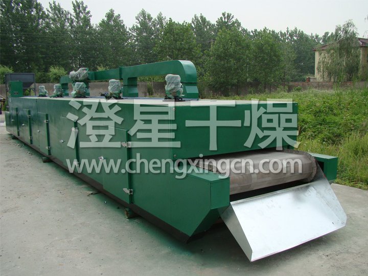 物料由加料器均勻地鋪在網(wǎng)帶上,網(wǎng)帶一般采用12-60目不銹鋼絲網(wǎng),由傳動(dòng)裝置拖動(dòng)在干燥機(jī)內(nèi)移動(dòng)。干燥機(jī)由若干單元組成,每一單元熱風(fēng)獨(dú)立循環(huán),部分尾氣由專門排濕風(fēng)機(jī)排出,廢氣由調(diào)節(jié)閥控制,熱氣由下往上或由上往下穿過鋪滿物料的網(wǎng)帶完成熱量與質(zhì)量傳遞的進(jìn)程,帶走物料水份。網(wǎng)帶緩慢移動(dòng),運(yùn)行速度可根據(jù)物料溫度自由調(diào)節(jié),干燥后的成品連續(xù)落入收料器中。上下循環(huán)單元根據(jù)用戶需要可靈活配備,單元數(shù)量亦可根據(jù)需要選取。