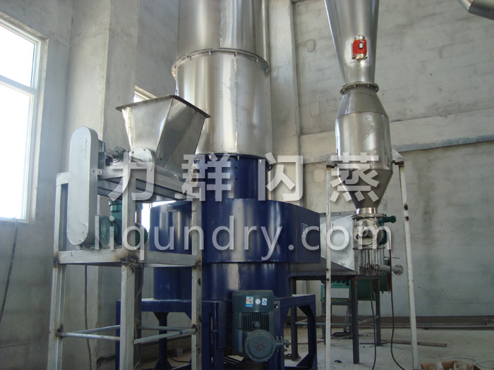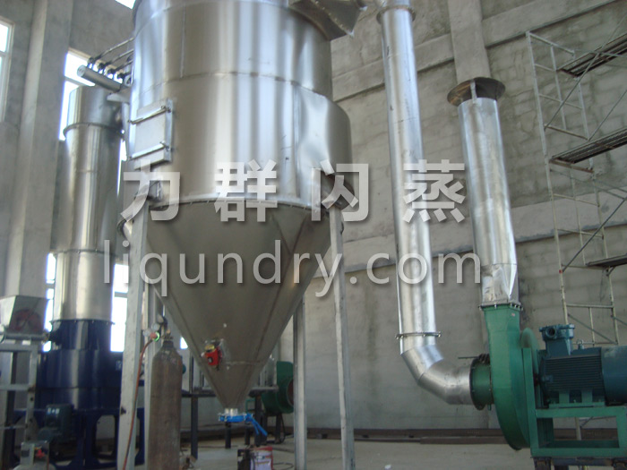 由于該產品的顆粒度要求在20-80目左右所以閃蒸干燥機的粉碎部分要做相應的調整,不能采用傳統的結構而且傳動電機的功率和轉速需采用變頻或調速儀控制。整套設備的進風溫度控制在150-160℃,出風溫度控制在70℃左右。物料有一定的粘性加料部分需采用雙螺旋加料機,整套設備在調試過程中一次性試車成功,一切技術要求全部達到設備運行穩(wěn)定。