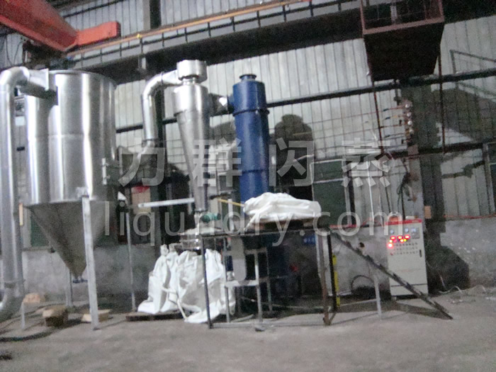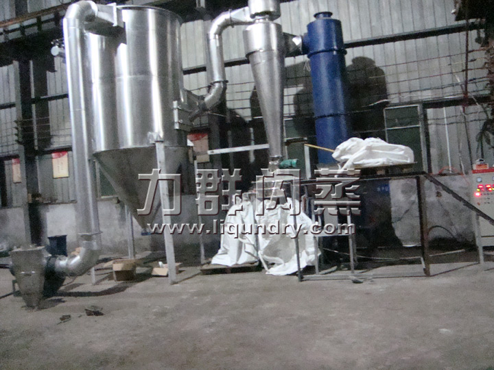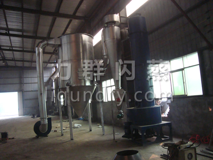 2、工作原理: 經(jīng)換熱器加熱后的潔凈空氣被鼓入進(jìn)風(fēng)口,以適宜的速度旋入干燥室底部的環(huán)隙,然后按切線方向進(jìn)入干燥室,并呈螺旋狀上升:同時(shí),物料則由可無(wú)級(jí)調(diào)速的加料器定量加入塔內(nèi)。在干燥塔內(nèi),物料與熱空氣進(jìn)行充分、高效的質(zhì)熱變換,被干燥的粉狀物料隨同熱風(fēng)一起輸送至分離器,其中成品收集包裝,而尾氣則進(jìn)一步經(jīng)除塵裝置處理后排空。